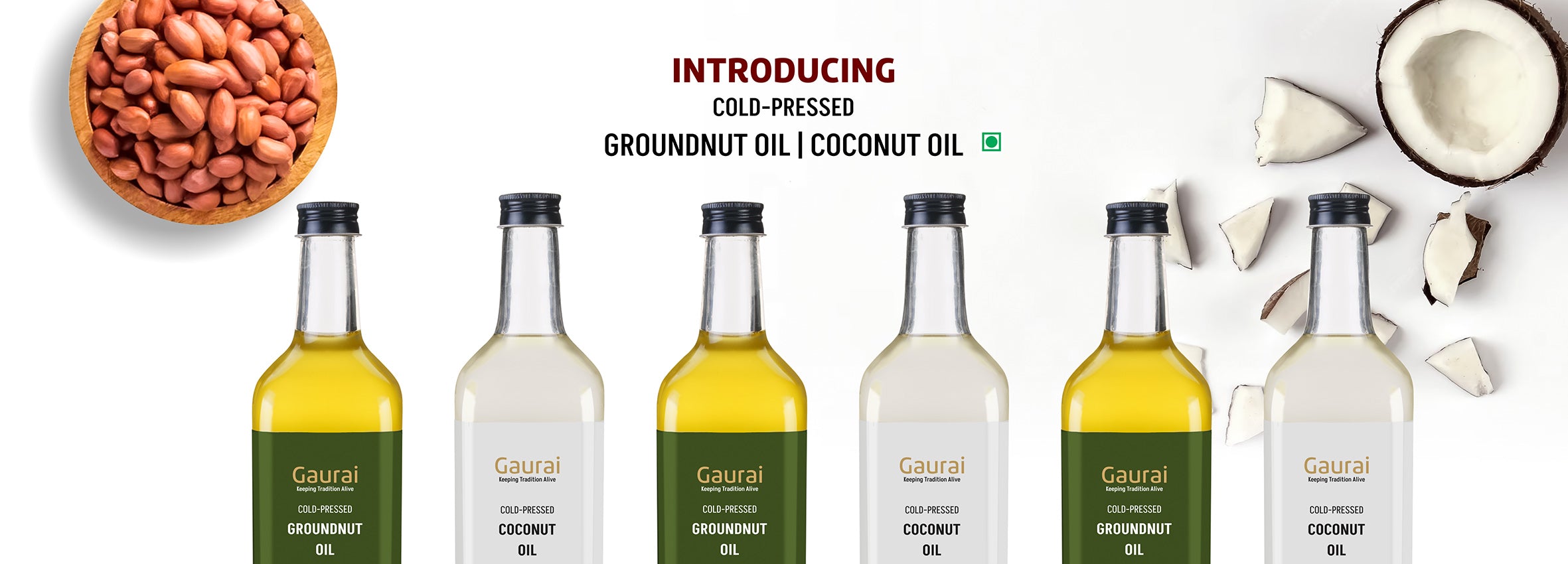 Gaurai premium cold-pressed oils bring together the best of tradition, health, and sustainability. GAURAI cold pressed range offers - Groundnut oil and Coconut oil. Whether you are a health-conscious individual, an avid food enthusiast, or a culinary professional, our oils are the perfect addition to your kitchen.